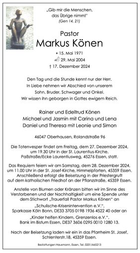 Voller Bestürzung haben wir vom Tod von Markus Könen erfahren, der am 17. Dezember 2024 plötzlich und unerwartet im Alter von nur 53 Jahren verstorben ist. Herr Könen war im ersten Halbjahr des Schuljahres 2023/2024 als Religionslehrer und Schulseelsorger am Antoniuskolleg tätig und fungierte auch im Anschluss noch als Ansprechpartner des Kriseninterventionsteams unserer Schule.