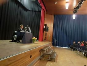 Schriftstellerin Judith Hermann, deren Erzählung "Sommerhaus, später" im Fach Deutsch für den Grundkurs Teil des Literaturkanons des Zentralabiturs NRW ist, war im Rahmen einer schulischen Lesereise auch zu Gast am Antoniuskolleg. Organisiert von Annette Schäfer las Hermann in der Aula des AK vor Schüler*innen der Jahrgangsstufen Q1 und Q2 nicht zuletzt aus ihrer mittlerweile abiturrelevanten Erzählung und kam mit den Jugendlichen ins Gespräch: Autorschaft, Schreibprozesse und die fortwährende Frage nach der "richtigen Interpretation" waren zentrale Aspekte des Autausches.